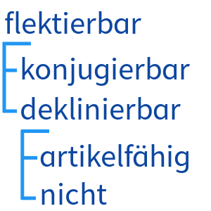 Flektierbare wortarten sind also beugbar. In der deutschen sprache gibt es zehn verschiedene wortarten, welche man in flektierbare (veränderliche) und in nicht flektierbare. Unter wortart, wortklasse oder lexikalischer kategorie versteht man die klasse von wörtern einer sprache aufgrund der zuordnung nach gemeinsamen grammatischen merkmalen. Veränderbare wortarten nennen wir flektierbare wortarten. Die in die reihe der nicht flektierbaren wortarten gehören außerdem die konjunktionen bzw.